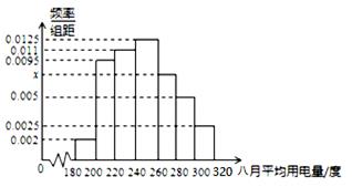 【题文】重庆因夏长酷热多伏旱而得名“火炉”,八月是重庆最热、用电量最高的月份.下图是沙坪坝区居民八月份用电量(单位:度)的频率分布直方图,其分组区间依次为: