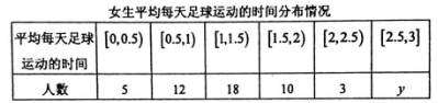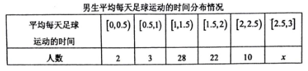 【题文】为响应阳光体育运动的号召,某县中学生足球活动正如火如荼地展开,该县为了解本县中学生的足球运动状况,根据性别采取分层抽样的方法从全县24000名中学生(其中男生14000人,女生10000人)中抽取120名,统计他们平均每天足球运动的时间,如下表:(平均每天足球运动的时间单位为小时,该县中学生平均每天足球运动的时间范围是