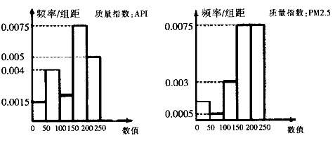 【题文】近年来某城市空气污染较为严重,为了让市民及时了解空气质量情况,气象部门每天发布空气质量指数“API”和“PM2.5”两项监测数据,某段时间内每天两项质量指数的统计数据的频率分布直方图如下所示,质量指数的数据在
