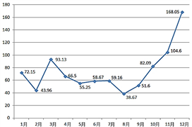 【题文】北京市2016年12个月的PM2.5平均浓度指数如右图所示.由图判断,四个季度中PM2.5的平均浓度指数方差最小的是