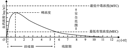 【题文】血药浓度(Plasma Concentration)是指药物吸收后在血浆内的总浓度. 药物在人体内发挥治疗作用时,该药物的血药浓度应介于最低有效浓度和最低中毒浓度之间.已知成人单次服用1单位某药物后,体内血药浓度及相关信息如图所示: