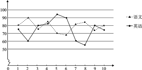 【题文】某校为研究学生语言学科的学习情况,现对高二200名学生英语和语文某次考试成绩进行抽样分析. 将200名学生编号为001,002,…,200,采用系统抽样的方法等距抽取10名学生,将10名学生的两科成绩(单位:分)绘成折线图如下:
