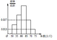 【题文】为了解今年某校高三毕业班准备报考飞行员学生的身体素质,学校对他们的体重进行了测量,将所得的数据整理后,画出了频率分布直方图(如图),已知图中从左到右的前3个小组的频率之比为1:2:3,其中第2小组的频数为12.