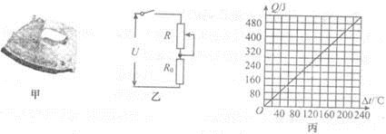 (3)假定电熨斗每秒钟散发的热量Q跟电熨斗表面温度与环境温度的温差△t关系如图丙所示,现在温度为20℃的房间使用该电熨斗来熨烫毛料西服,要求熨斗表面温度为220℃,且保持不变,问应将R的阻值调为多大?