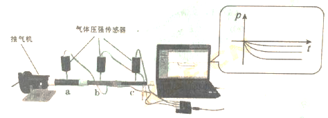 【题文】如图所示,三个直径不同的塑料管a,b,c连接在一起(a管直径最大,c管直径最小),然后与抽气机相通。当抽气机抽气时,将三个气体压强传感器分别放入管内,将传感器与计算机相连,从计算机上就可以读出三个位置气体的压强值。图中显示器所显示的“压强—时间”图象中,最下面一条曲线对应的塑料管是 ( )