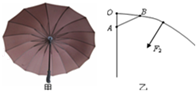 【题文】如图甲将伞撑开时,伞的每条骨架都可近似看成一个杠杆,乙图是其中一条骨架的示意图,伞面对骨架的压力为阻力F