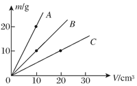 【题文】A、B、C三种物质的质量m与体积V的关系图像如图所 示.由图可知A、B、C三种物质的密度