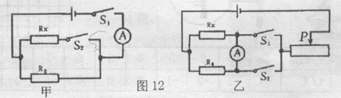 【题文】小乐想用电源、一个电流表、两只开关和阻值已知的电阻R0测量电阻R X的阻值。并连接了如图l2甲所示电路进行实验。只闭合开关S 1时电流表的示数为I 1; 闭合开关S 1和 S 2时电流表的示数为I 2,则电阻R X中的电流为 _______,Rx= ___________ (用I 1;I、I 2 和R。表示)。小明认为此电路不妥.缺少了滑动变阻器,他没计了另外一种电路,如图12乙所示,他认为只闭合开关S 1,电流表测得的是R。中的电流.只闭台开关S 2,电流表测得的是Rx中的电流.这样也可以测量电阻Rx的阻值。请你帮助说明一下,在测量电阻的电路中加了滑动变阻器的好处是___________________________________________ ,但是小明的这种测法______________ (选填‘‘正确”或“不正确”),理由是 ____________