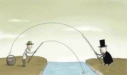 【题文】请仔细观察下面这幅漫画,描述它的画面内容,并揭示其中的寓意,要求语意简明,句子通顺。