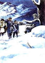 一个冻僵的老战士,倚靠一棵光秃秃的树干坐着,一动也不动,好似一尊塑像。他浑身都落满了雪,可以看出镇定、自然的神情,却一时无法辨认面目,半截带卷儿的旱烟还夹在右手的中指和食指间,烟火已被飞雪打熄。他微微向前伸出手来,好像要向战友们借火……怎么?他的衣服这么单薄、破旧?像树叶,像箔片一样薄薄地贴在身上……他的御寒衣物呢?为什么没有发下来?