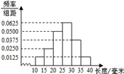 【题文】对一批产品的长度(单位:毫米)进行抽样检测,样本容量为200,右图为检测结果的频率分布直方图,根据产品标准,单件产品长度在区间[25,30)的为一等品,在区间[20,25)和[30,35)的为二等品,其余均为三等品,则样本中三等品的件数为