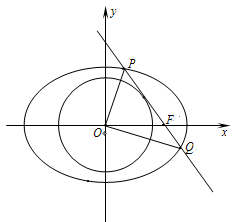 ①若直线l过椭圆C的右焦点F,求△OPQ的面积;