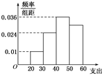 【题文】学校为了调查学生在课外读物方面的支出情况,抽出了一个容量为n且支出在[20,60)元的样本,其频率分布直方图如图所示,其中支出在[50,60)元的学生有30人,则n的值为( )