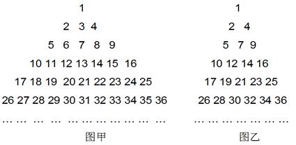 【题文】把正整数排列成如下图甲的三角形数阵,然后擦去第偶数行的奇数和第奇数行中的偶数,得到如图乙的三角数阵,再把图乙中的数按从小到大的顺序排成一列,得到数列
