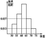 【题文】(本小题满分12分)为了解今年某校高三毕业班准备报考飞行员学生的体重情况,将所得的数据整理后,画出了频率分布直方图(如图),已知图中从左到右的前3个小组的频率之比为1:2:3,其中第2小组的频数为12.
