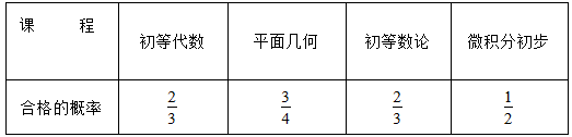 【题文】(本小题满分12分)某高中数学竞赛培训在某学段共开设有初等代数、平面几何、初等数论和微积分初步共四门课程,要求初等数论、平面几何都要合格,且初等代数和微积分初步至少有一门合格,则能取得参加数学竞赛复赛的资格.现有甲、乙、丙三位同学报名参加数学竞赛培训,每一位同学对这四门课程考试是否合格相互独立,其合格的概率均相同(见下表),且每一门课程是否合格相互独立.