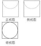 【题文】如图是一个无盖器皿的三视图,正视图、侧视图和俯视图中的正方形边长为2,正视图、侧视图中的虚线都是半圆,则该器皿的表面积是( )