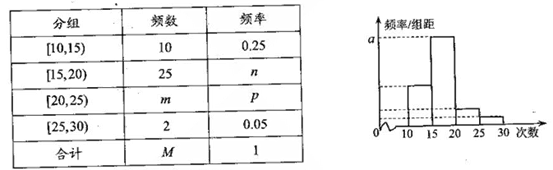 【题文】对某校高二年级学生参加社区服务次数进行统计,随机抽取M名学生作为样本,得到这M名学生参加社区服务的次数根据此数据作出了频数与频率的统计表和频率分布直方图如下: