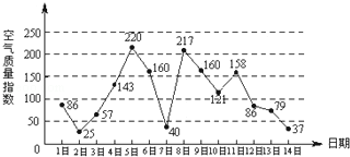 【题文】如图是某市3月1日至14日的空气质量指数趋势图,空气质量指数小于100表示空气质量优良,空气质量指数大于200表示空气重度污染,某人随机选择3月1日至3月13日中的某一天到达该市,并停留2天.