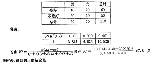 | D.在犯错误的概率不超过0.1%的前提下,认为“爱好该项运动与性别无关” |