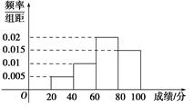 【题文】某班的全体学生参加英语测试,成绩的频率分布直方图如图,数据的分组依次为:[20,40),[40,60),[60,80),[80,100].若低于60分的人数是15,则该班的学生人数是( )