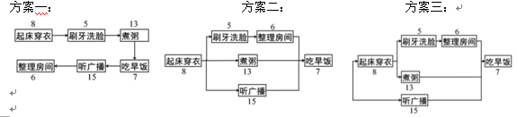 【题文】李强用流程图把早上上班前需要做的事情做了如下几种方案,则所用时间最少的方案是_______