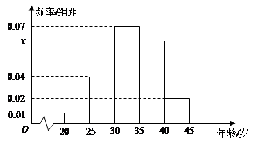 随机抽取100名志愿者,其年龄频率分布直方图如图所示,其中年龄分组区间是: