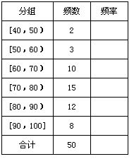 [40,50), 2; [50,60), 3; [60,70), 10; [70,80), 15; [80,90), 12; [90,100], 8.