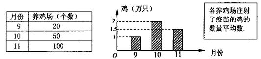 【题文】为了了解“预防禽流感疫苗”的使用情况,某市卫生部门对本地区9月份至11月份注射疫苗的所有养鸡场进行了调查,根据下图表提供的信息,可以得出这三个月本地区每月注射了疫苗的鸡的数量平均为