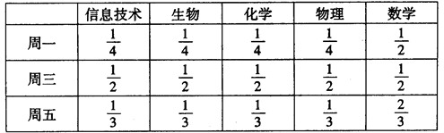 【题文】河南省某示范性高中为了推进新课程改革,满足不同层次学生的需求,决定从高一年级开始,在每周的周一、周三、周五的课外活动期间同时开设数学、物理、化学、生物和信息技术辅导讲座,每位有兴趣的同学可以在期间的任何一天参加任何一门科目的辅导讲座,也可以放弃任何一门科目的辅导讲座(规定:各科达到预先设定的人数时称为满座,否则称为不满座).统计数据表明,各学科讲座各天的满座概率如下表: