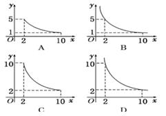【题文】一张正方形的纸片,剪去两个一样的小矩形得到一个“E”形图案,如图所示,设小矩形的长、宽分别为x、y,剪去部分的面积为20,若2≤x≤10,记y=f(x),则y=f(x)的图象是 ( )