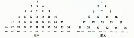 【题文】把正整数排列成如图甲的三角形数阵,然后擦去第偶数行中的奇数和第奇数行的偶数,得到如图乙的三角形数阵,再把图乙中的数按从小到大的顺序排成一列,得到一个数列