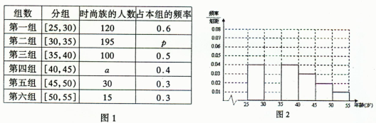 某高中社团进行社会实践,对[25,55]岁的人群随机抽取n人进行了一次是否开通“微博”的调查,若开通“微博”的称为“时尚族”,否则称为“非时尚族”。通过调查分别得到如图1所示统计表如图2所示各年龄段人数频率分布直方图: