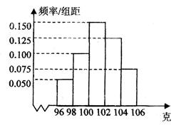 【题文】(本小题满分13分)某工厂对一批产品的质量进行了抽样检测,右图是根据抽样检测后的产品净重(单位:克)数据绘制的频率分布直方图.已知样本中产品净重小于100克的个数是36个。