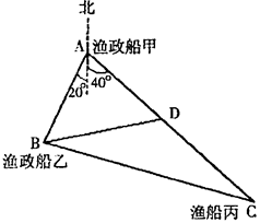 正在海上A处执行任务的渔政船甲和在B处执行任务的渔政船乙,同时收到同一片海域上一艘渔船丙的求救信号,此时渔船丙在渔政船甲的南偏东40°方向距渔政船甲70km的C处,渔政船乙在渔政船甲的南偏西20°方向的B处,两艘渔政船协调后立即让