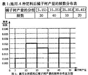 中样本橘子树产量的分组区间为[5,15),[15,25),[25,35),[35,45),[45,55),由此得到表1和图1的所示内容,其中表1是施用A种肥料后橘子树产量的频数分布表,图1是施用B种肥料后橘子树产量的频率分布直方图.