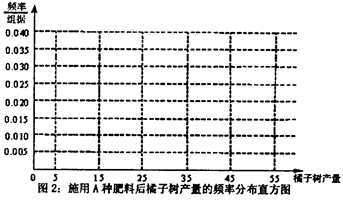 (Ⅰ)完成图2和表2,其中图2是施用A种肥料后橘子树产量的频率分布直方图,表2是施用B种肥料后橘子树产量的频数分布表,并