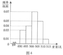【题文】((本小题满分12分) 某食品厂为了检查一条自动包装流水线的生产情况,随机抽取该流水线上的40件产品作为样本称出它们的重量(单位:克),重量的分组区间为(490,495],(495,500],……,(510,515],由此得到样本的频率分布直方图,如图4所示.