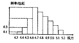 【题文】随机抽查某中学高三年级100名学生的视力情况,得其频率分布直方图如右图所示。已知前4组的频数成等比数列,后6组的频数成等差数列,则视力在4.6到5.0之间的学生人数为