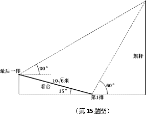 【题文】某校运动会开幕式上举行升旗仪式,旗杆正好处在坡度15°的看台的某一列的正前方,从这一列的第一排和最后一排测得旗杆顶部的仰角分别为60°和30°,且第一排和最后一排的距离为