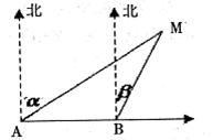 的方位角为北偏东α角,前进m(km)后在B处测得